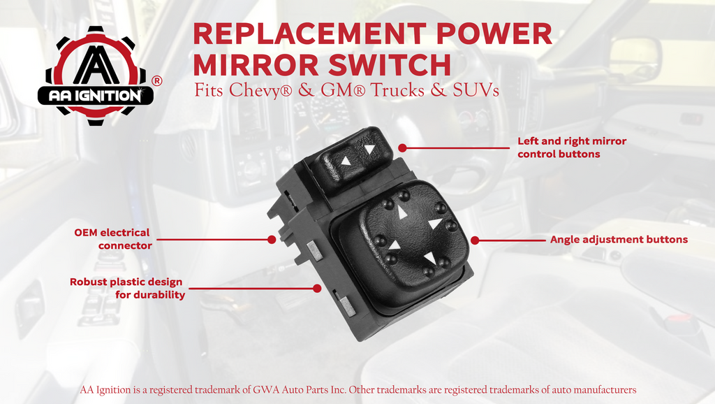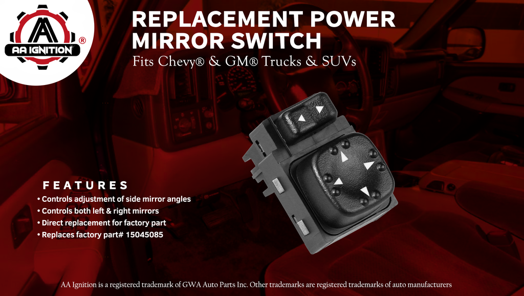 • Replacement Power Mirror Switch - controls vertical or horizontal adjustment of your side view mirror angles. If you cannot control your side mirrors then you may have a problem with your power mirror switch. This replacement power mirror switch from AA Ignition controls both the left and right mirror adjustments.