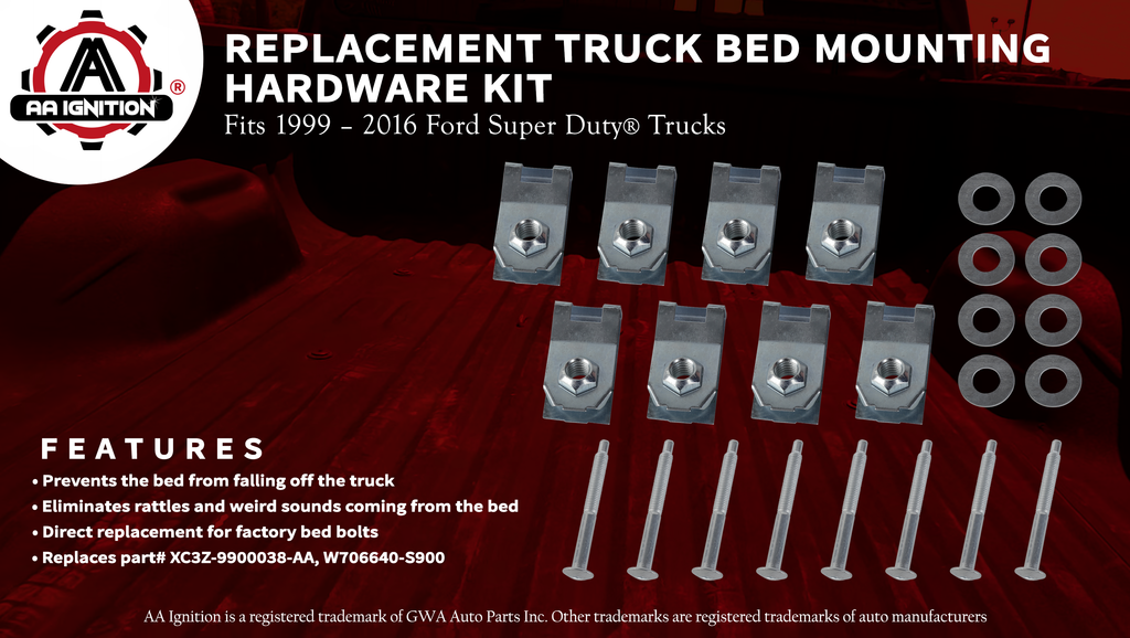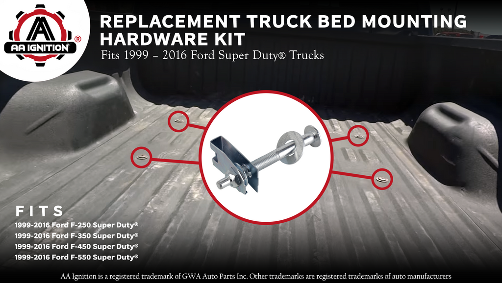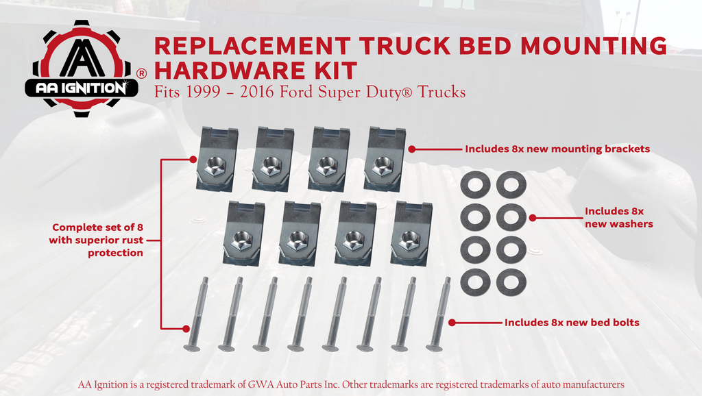 - Replacement Bed Mounting Hardware Kit - keeps the bed in place tight and secure. Bolts get seized, rusted over time and be a pain to remove without destroying it making it not possible to use again. This bed bolt hardware kit replaces all the mounting hardware for the Super Duty trucks from years 99-16 and allows you to put the bed back or replace it.