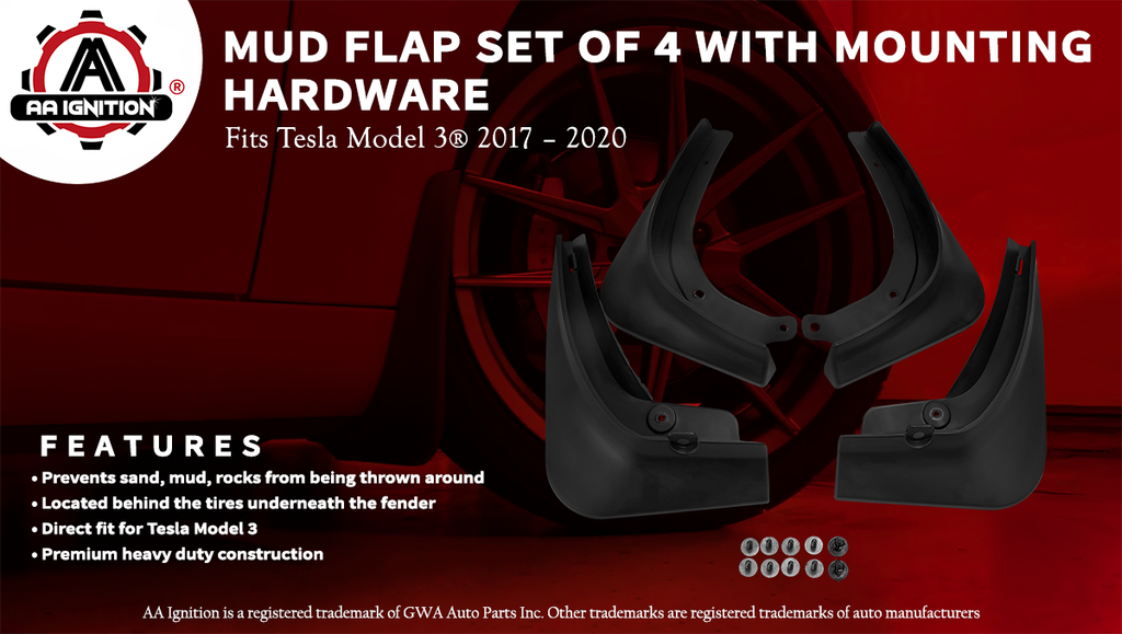 - OEM Fit, Quality, Finish - This mudguard set of 4 manufactured by AA Ignition are specifically made for the Model 3 and will require putting a screw on each of the front tires for that tight snug fit at the top portion of the flap.