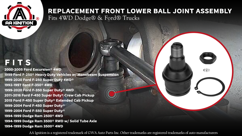 - Compatible Replacement for Ford and Dodge Vehicles - 2000 - 2005 Excursion 4WD | 1999 F-250 Heavy Duty | 1999 - 2020 F-250 & F-350 Super Duty | 1992 - 1997 F-350 4WD | 2011 - 2016 F-450 Super Duty | 2015 F-450 Super Duty | 1999 - 2004 F-450 | 1994 - 1999 Ram 2500, 3500 RWD, 3500 4WD |. If you are experiencing clunking noises from the front suspension, excessive vibration on the front of the vehicle or your steering wanders to the left or right then you may have a bad or failing ball joint.